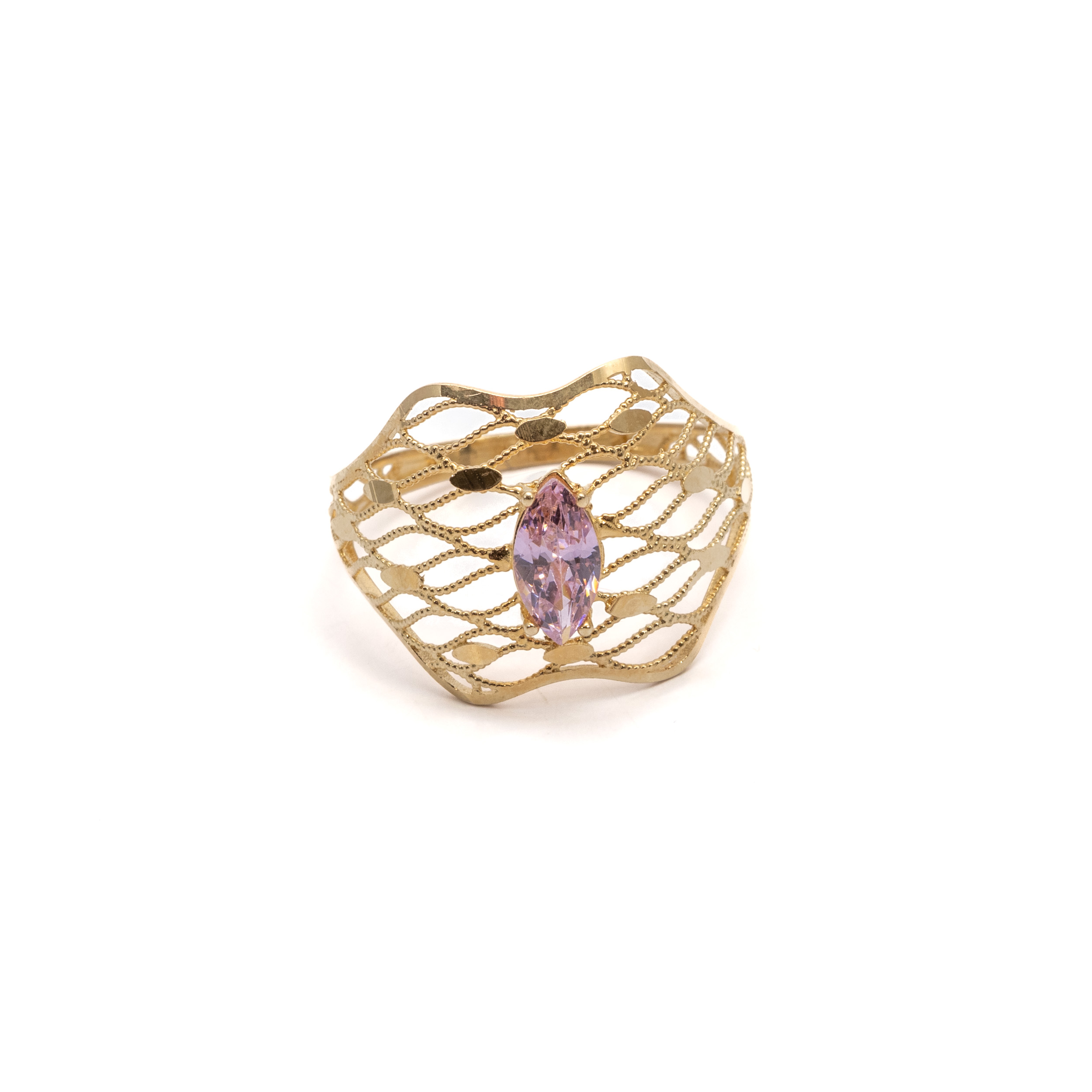 14K női sárga arany áttört gyűrű lila kővel